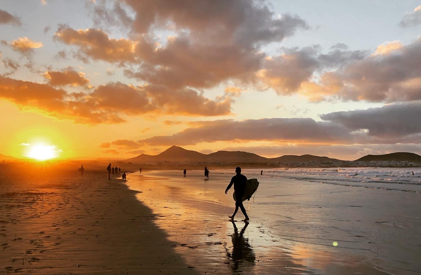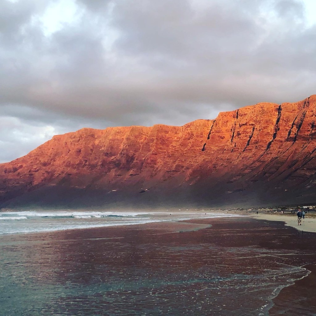 Ved det siste huset går det sti ned. Vi gikk ned til stranden igjen, helt ned i vannkanten, plukket av oss turskoene og gikk barbent i dønningene i møte med solnedgangen – hele veien tilbake til Caltea de Famara . Det var et lys- og fargespill jeg kommer til å hente frem ved når jeg trenger gode tanker.