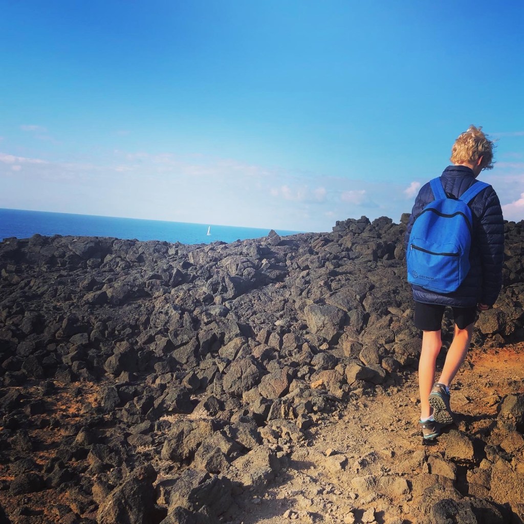 Vi fulgte lavakanten da vi la i vei etter ungdommen. Landskapet var øde, det var ikke et menneske å se og vi ble urolige – hvor ble han av? Han hadde vel ikke fortsatt videre nordover kyststien likevel? Jeg skriver dette for å nevne at det ikke er mobildekning overalt i nasjonalparken. Vi ble veldig glade da vi så ham sitte og vente på et gjerde som markerer skillet mellom nasjonalparken og området rundt.