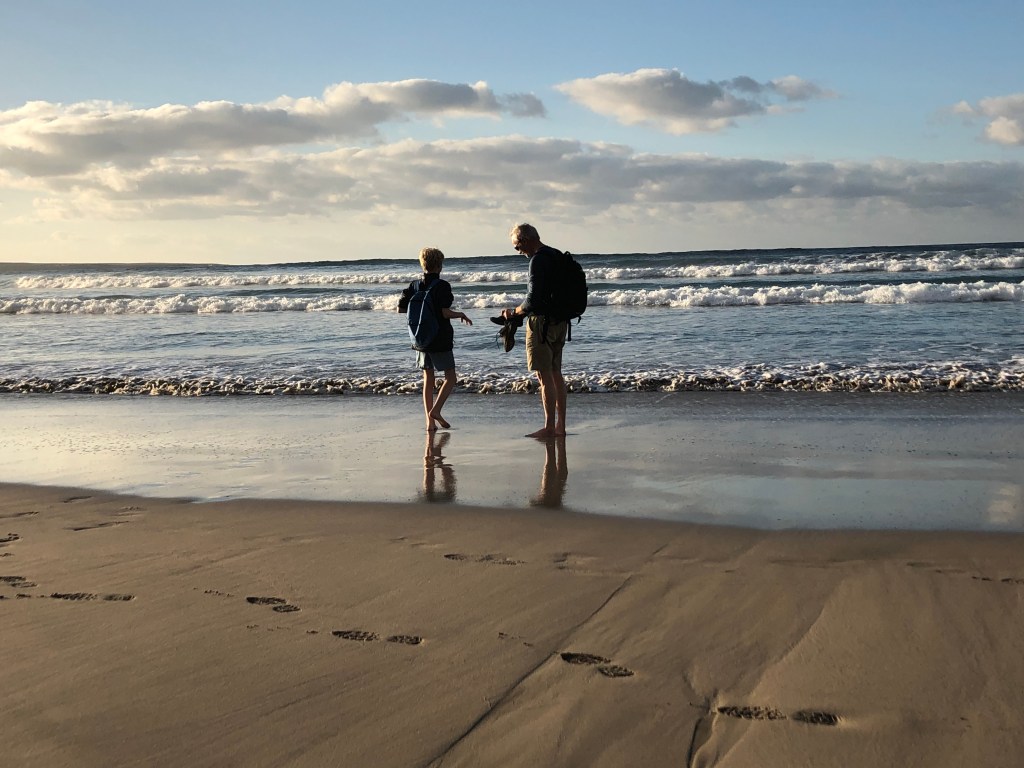 På turveien var vi beskyttet av fjellene, det var fullstendig vindstille. Straks vi kom ned på stranden ble det behov for å finne frem mer klær og beskytte seg mot vinden, den var atskillig kaldere enn vannet vi vasset i.
